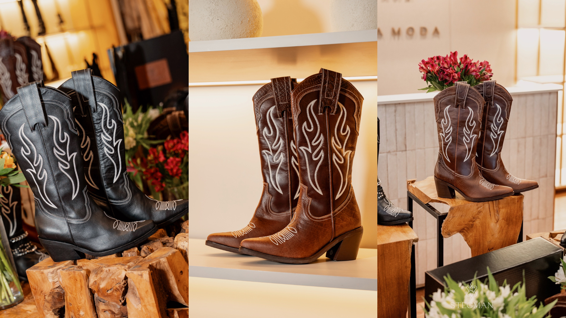 La colección de Stegman está marcada por una estética texana reinterpretada, con modelos que varían en altura —desde versiones más bajas y versátiles, hasta diseños de caño alto que se convierten en protagonistas. Los bordados contrastantes, los recortes en cuero y las siluetas limpias en tonos marrón, blanco y negro refuerzan su carácter contemporáneo. Cada diseño refleja una mezcla entre actitud y estilo, pensada para acompañar cualquier look con naturalidad.