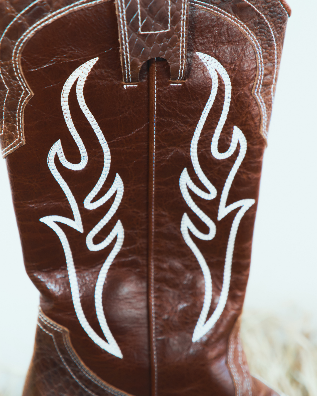 Los bordados en hilo blanco flameante recorren la caña como un fuego estilizado, aportando movimiento visual y un contraste audaz. Combinación de dos distintos cueros y la puntera alargada, decorada con un trazo ornamental en hilo tenso, suma fuerza a su estética sin dejar de ser femenina.