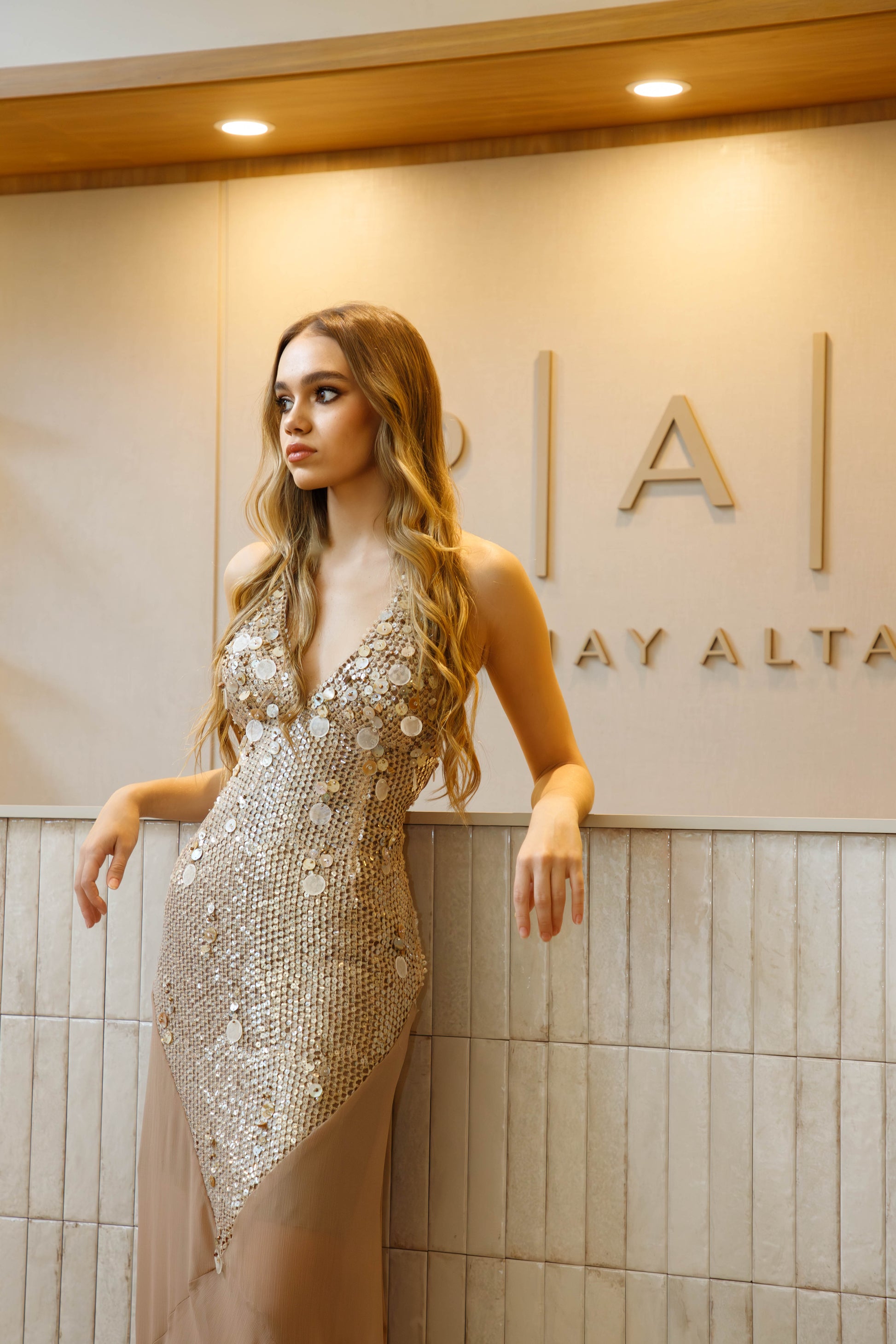 Vestido largo, parte superior con redecilla y bordados con nacars, falda de gasa