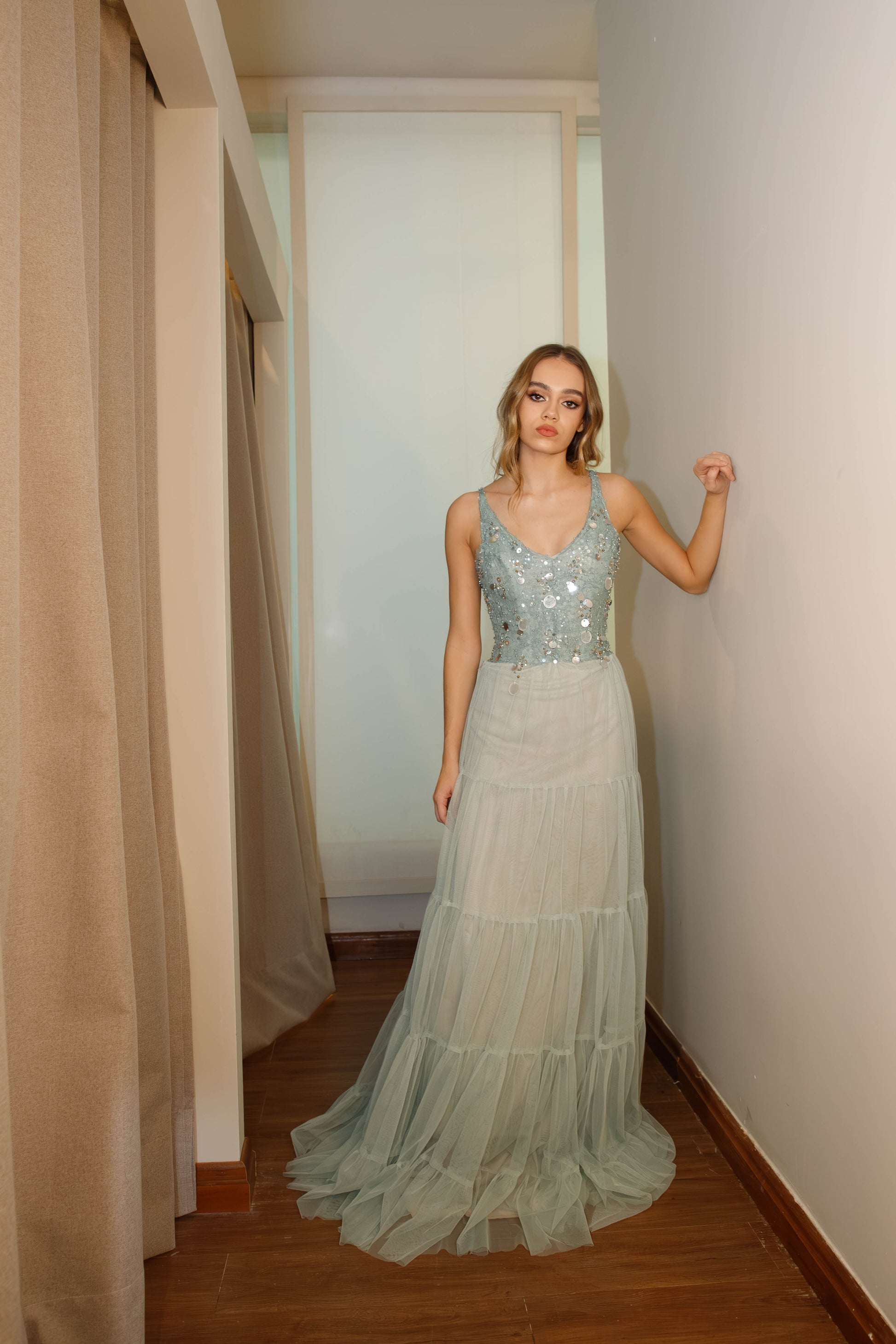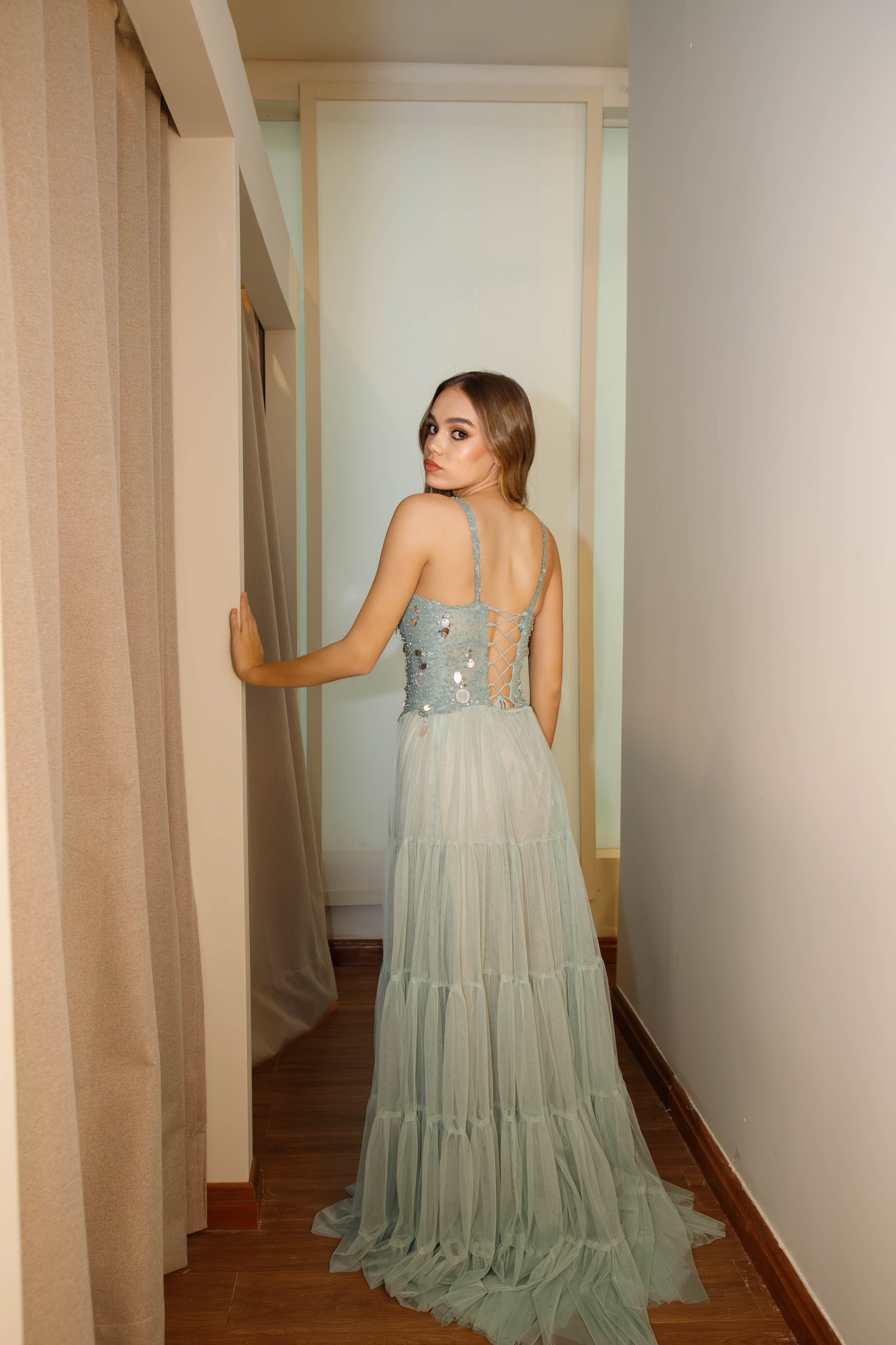 Vestido largo en tonalidades aqua con escote V y falda de tul