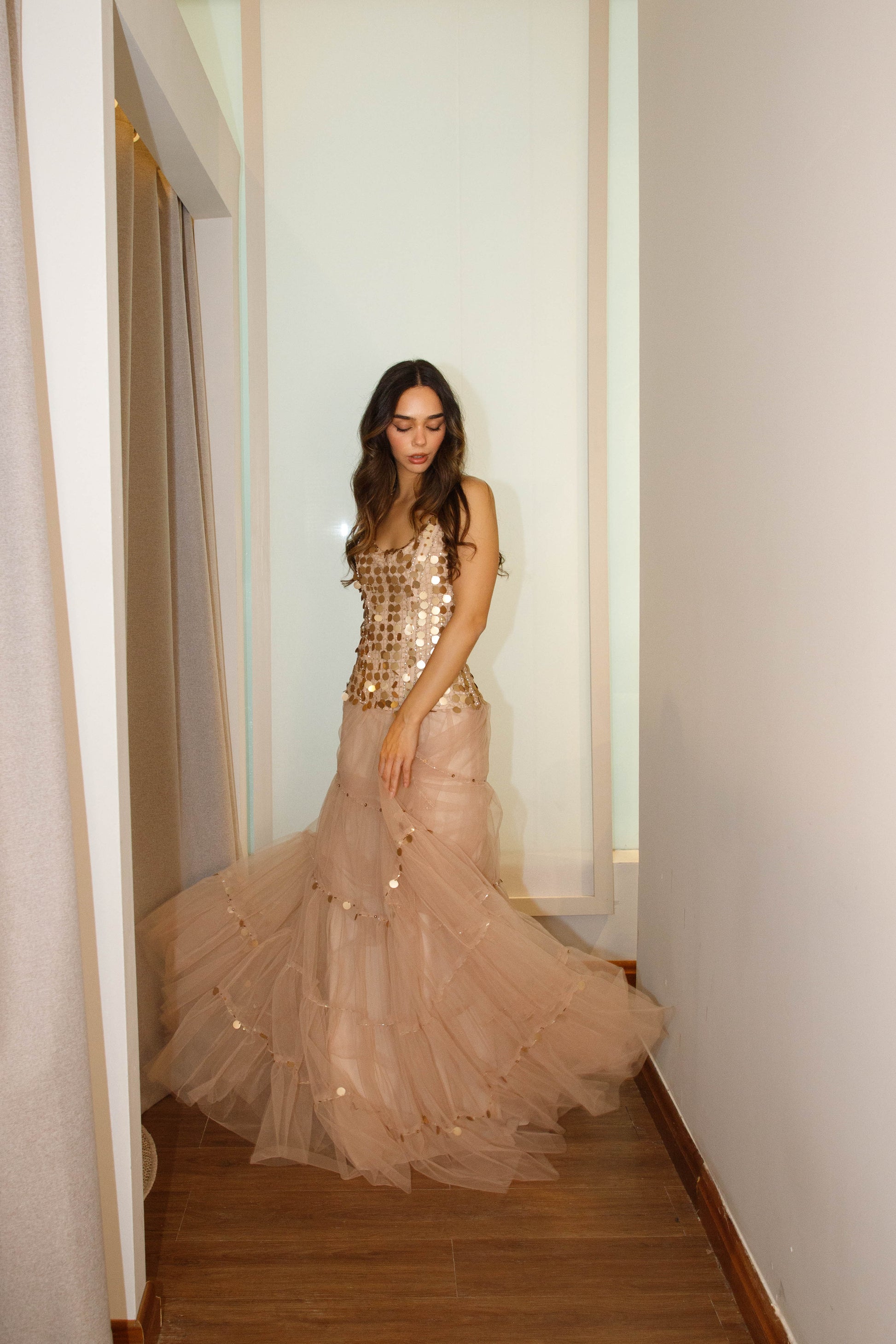 Corset con apliques de lentejuelas doradas y falda de tul